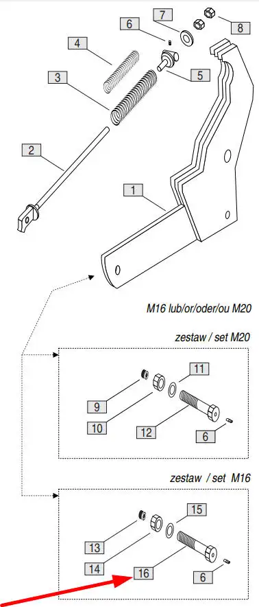 Oryginalna śruba smarna o wymiarach M16 x 2.0 x 90, długości gwintu 29mm, klasie twardości 10.9 i numerze katalogowym 07-02-0147, stosowana w agregatach ścierniskowych marki Mandam.