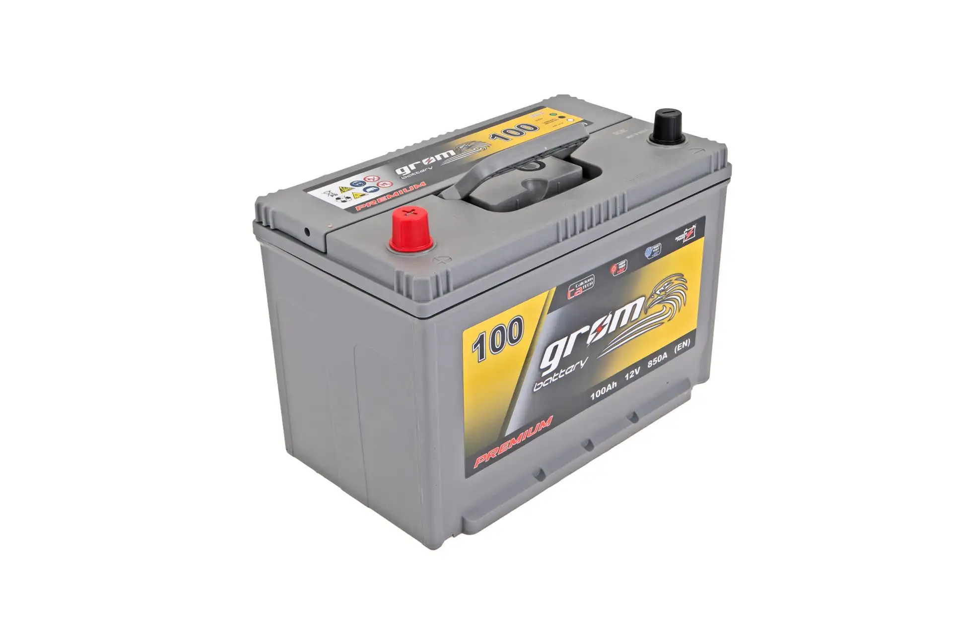 Akumulator marki Grom Premium o napięciu 12V, pojemności 100Ah, prądzie rozruchowym 850A i numerze katalogowym 100XPGPJ, stosowany w maszynach i pojazdach wielu marek.