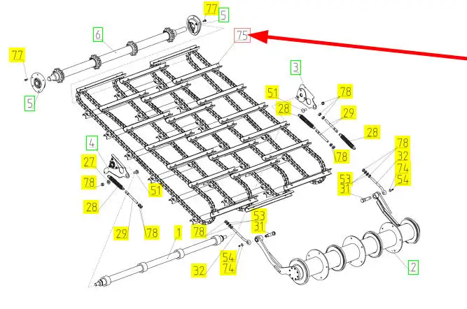Oryginalny zestaw łańcuchów przenośnika pochyłego z listwami o numerze katalogowym 102522746, stosowany w kombajnach zbożowych marki Rostselmash.