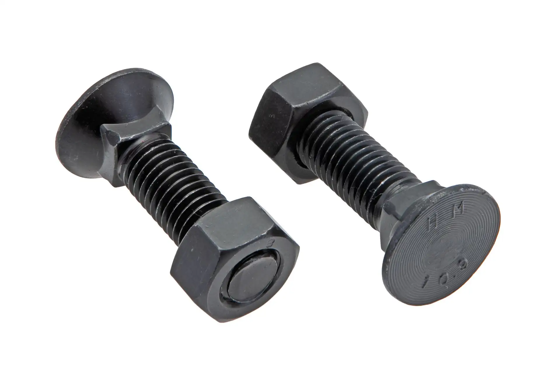 Śruba płużna z nakrętką o wymiarach M12x45, klasie twardości 10.9 i numerze katalogowym 1245109VK, stosowana w pługach rolniczych wielu marek.