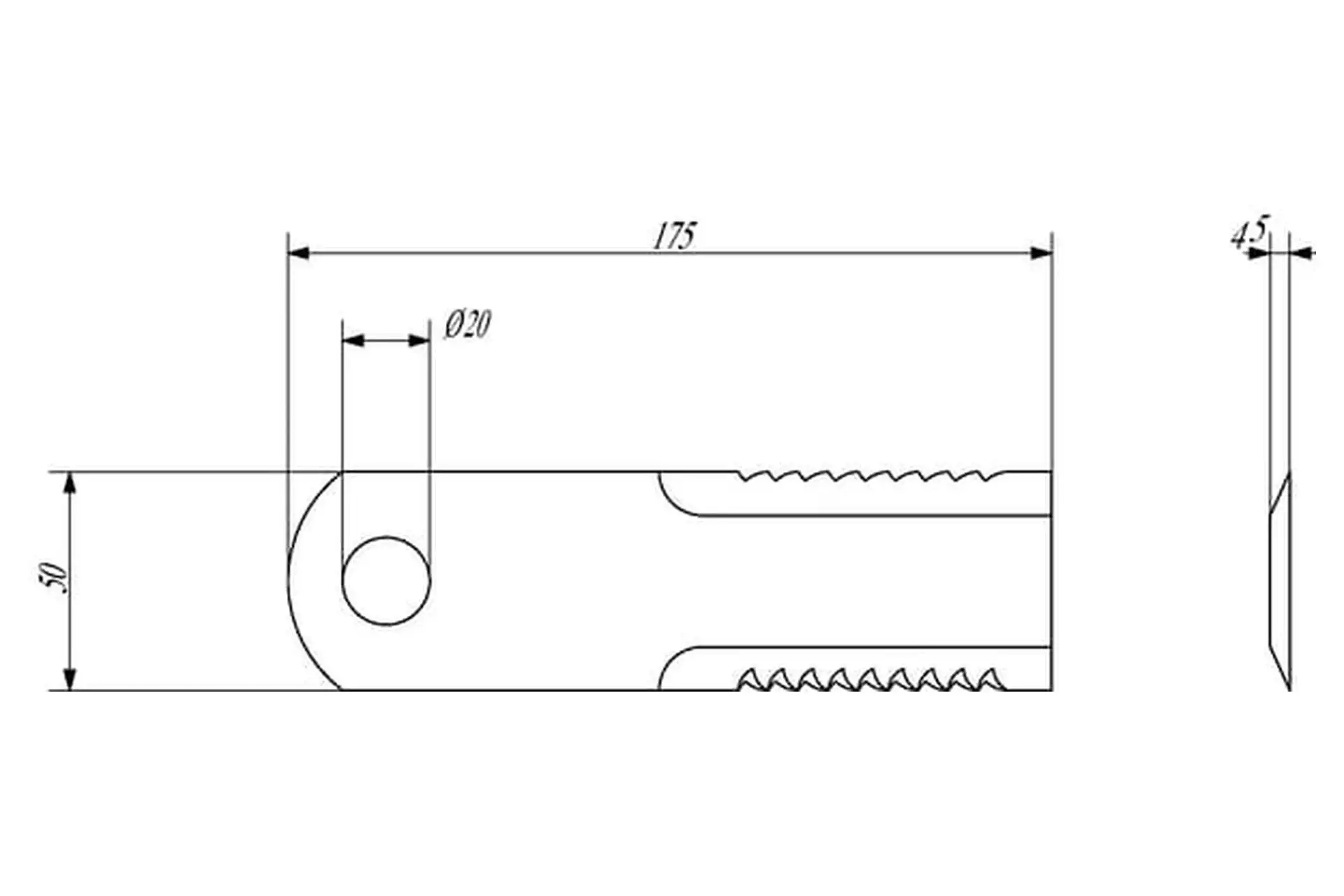 Nóż ruchomy rozdrabniacza słomy o wymiarach 175 x 50 x 4.5, Fi 20 mm i numerze katalogowym 134810N, stosowany w kombajnach zbożowych marek Challenger, Fendt i Massey Ferguson.