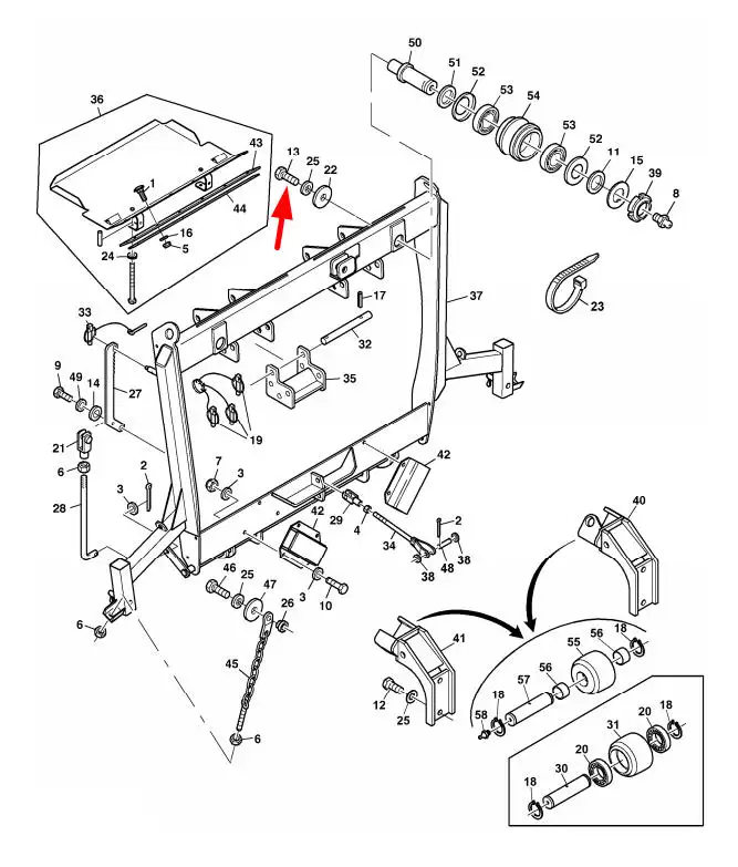 Oryginalna śruba o wymiarach M16 x 45 i numerze katalogowym 19M9659, stosowana w adapterach do kukurydzy marki Kemper.