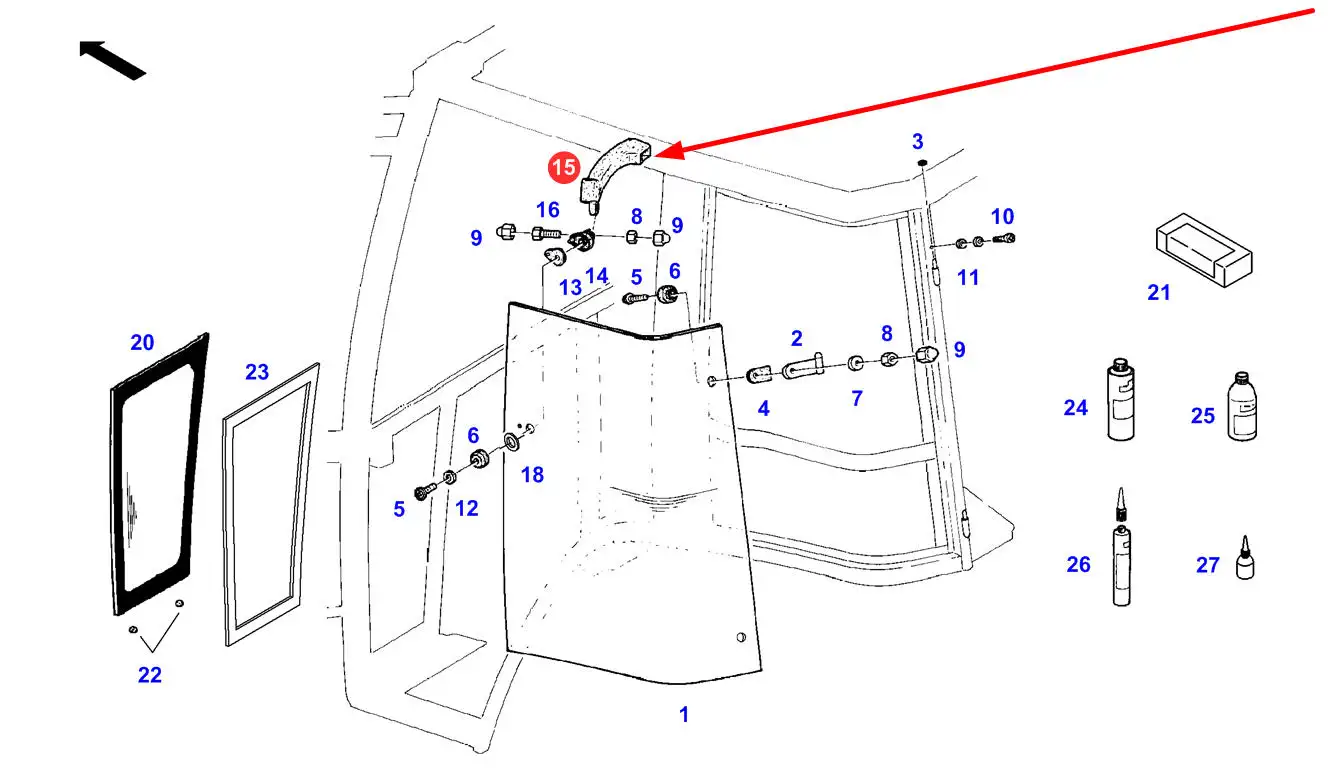 Oryginalny uchwyt otwierania bocznej szyby o numerze katalogowym 247811040111, stosowany w ciągnikach rolniczych marki Fendt.