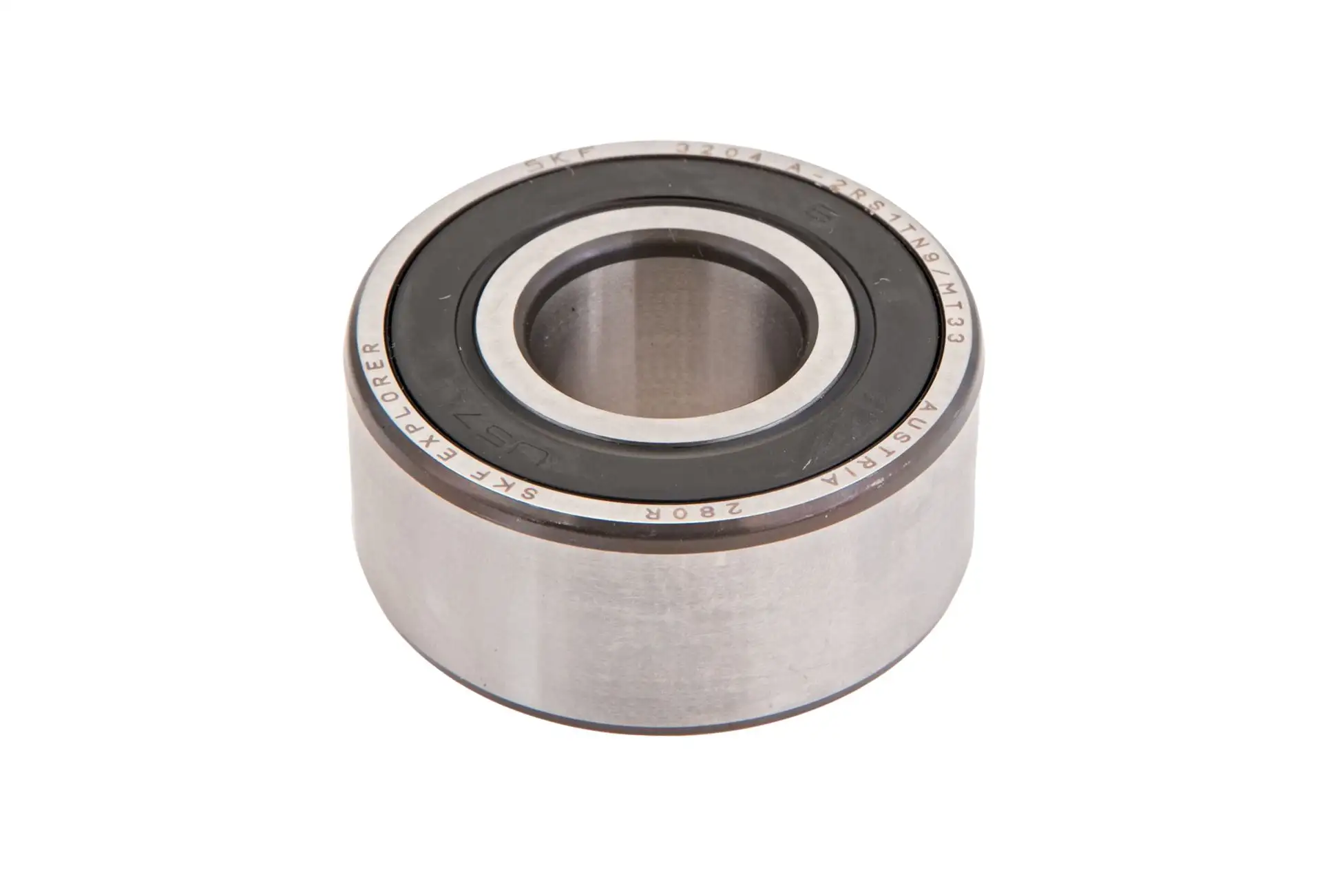 Łożysko kulkowe skośne 2-rzędowe o wymiarach 20 x 47 x 20.6 o oznaczeniu 3204A2RS1TN9/MT33 marki SKF, szeroko stosowane w maszynach i pojazdach wielu marek.