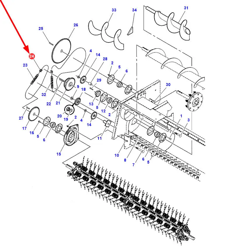 Oryginalne ogniwo łańcucha o numerze katalogowym 329277M91, stosowane w prasach wielkogabarytowych marki Massey Ferguson i Fendt.