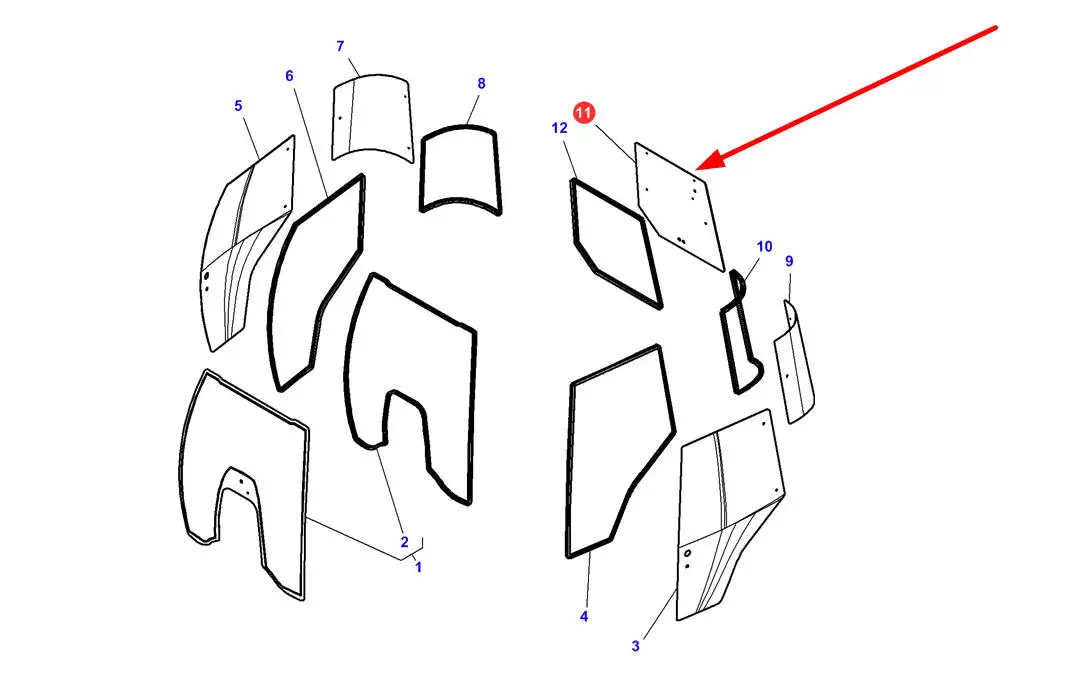 Szyba tylna, górna kabiny o numerze katalogowym 3715438M1N, stosowana w ciągnikach rolniczych marek Massey Ferguson i Challenger.