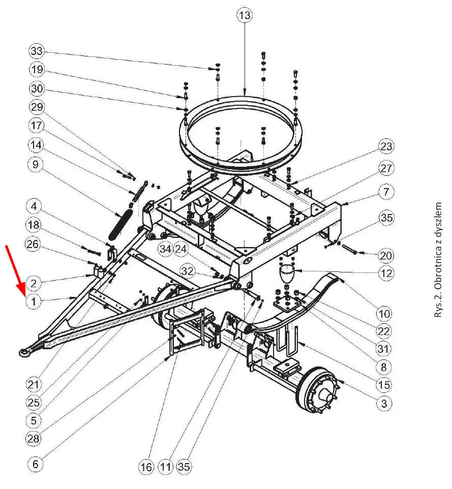 Oryginalny dyszel przyczepy DB 125 KN 9t. o numerze katalogowym 38065, stosowany w przyczepach rolniczych DB 12 oraz 14 marki Metaltech.