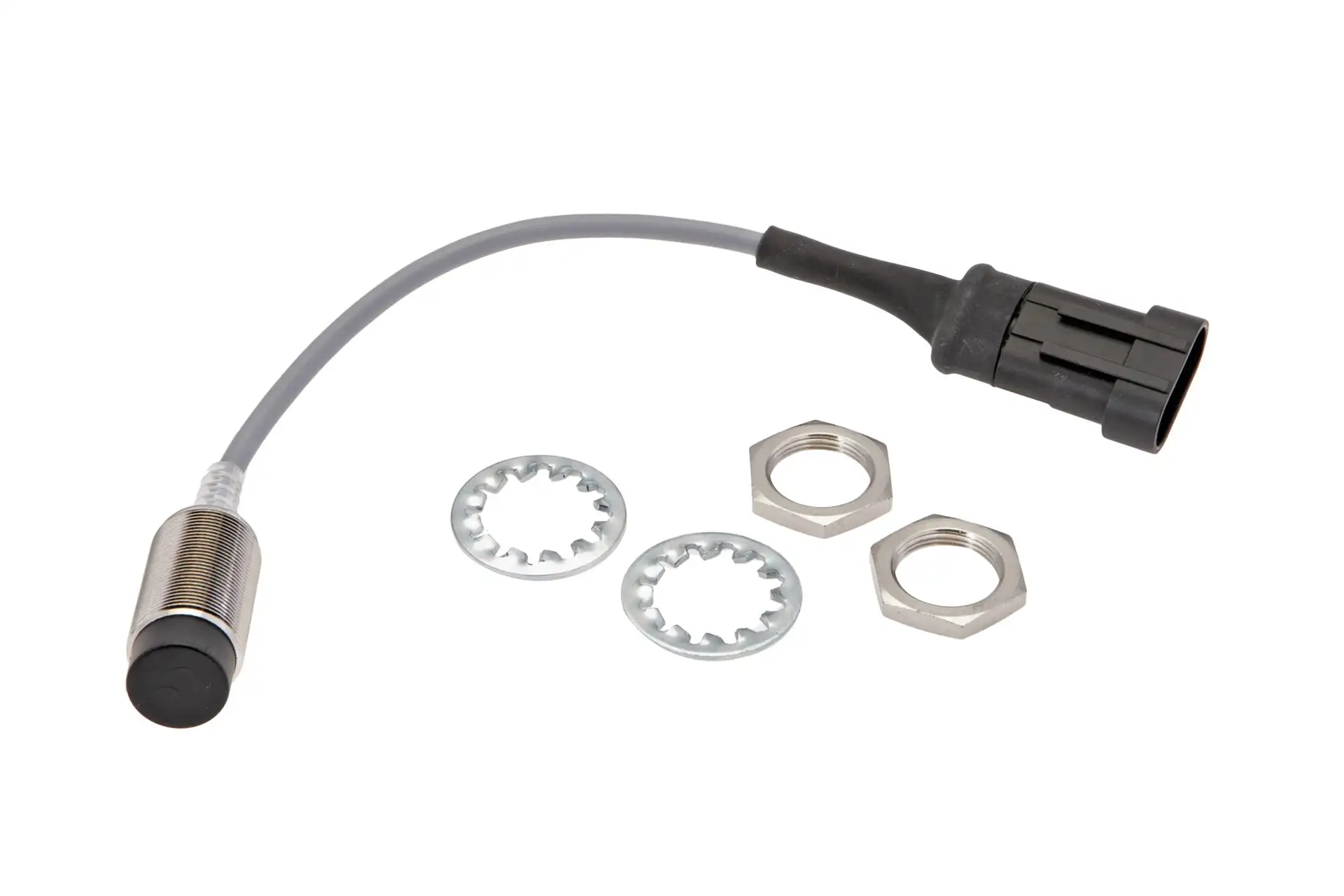 Oryginalny czujnik indukcyjny M18 o długości 250 mm i numerze katalogowym 410000218, stosowany w rozrzutnikach obornika marki Bergmann.
