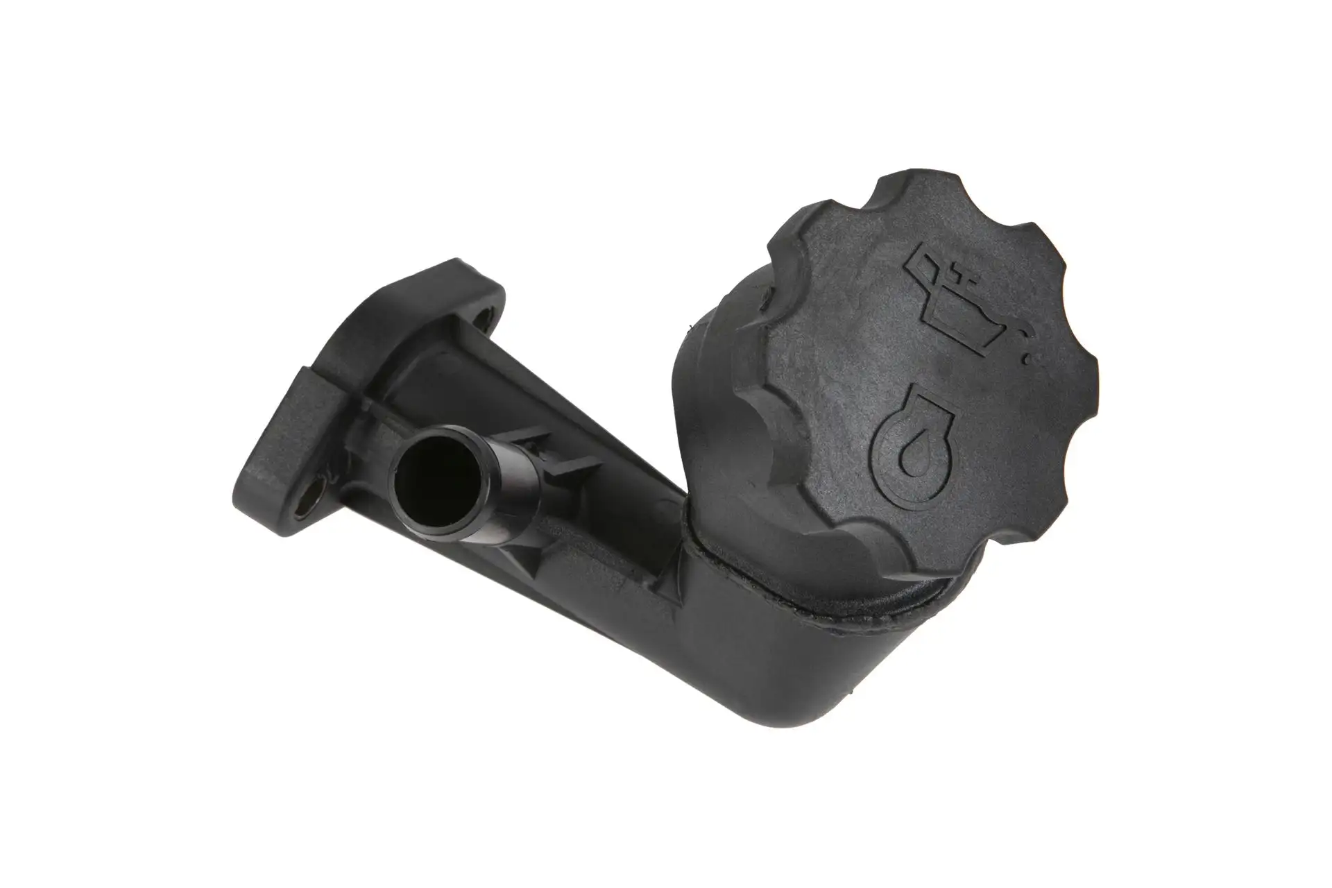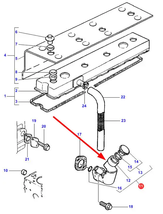 Oryginalny wlew oleju silnikowego z korkiem zamykającym o numerze katalogowym 222041M1, stosowany w ciągnikach rolniczych marki Massey Ferguson.