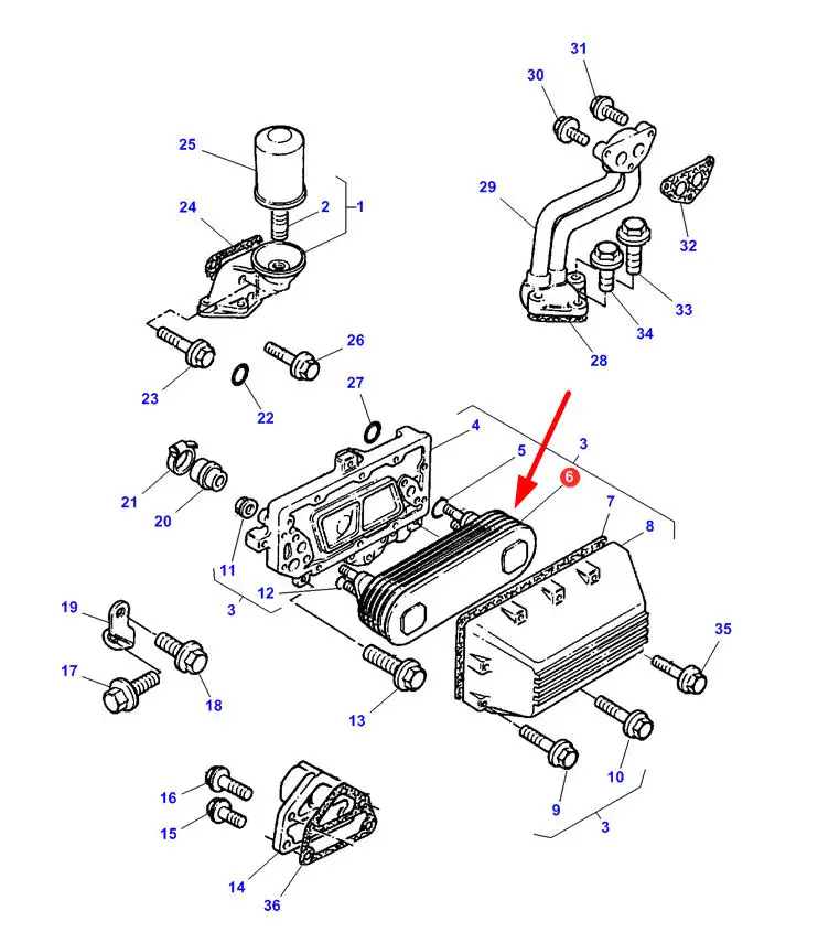 Oryginalna chłodnica oleju silnikowego o numerze katalogowym 4223608M91, stosowana w ciągnikach rolniczych marki Massey Ferguson.