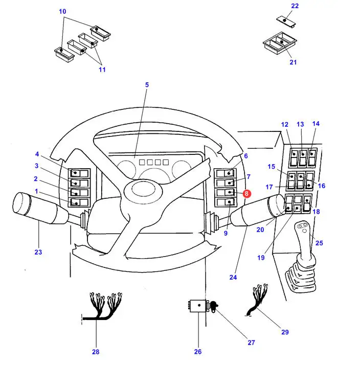 Oryginalny włącznik marki Massey Ferguson o numerze katalogowym 4232849M stosowany w panelach sterowania w kabinach ładowarek teleskopowych marki Massey Ferguson.