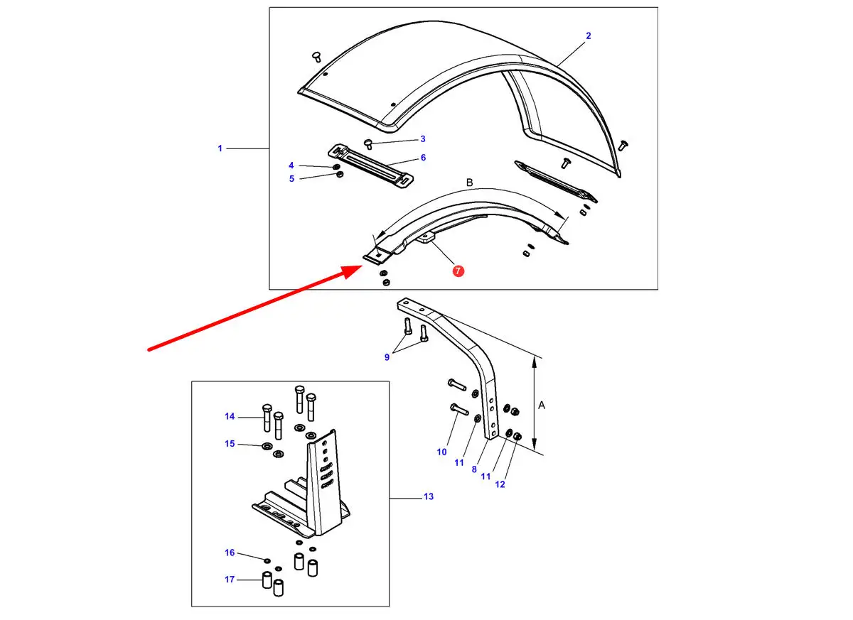 Oryginalne mocowanie błotnika o wymiarze 850 mm i numerze katalogowym 4348349M1, stosowane w ciągnikach rolniczych marki Massey Ferguson, Valtra i Challenger.