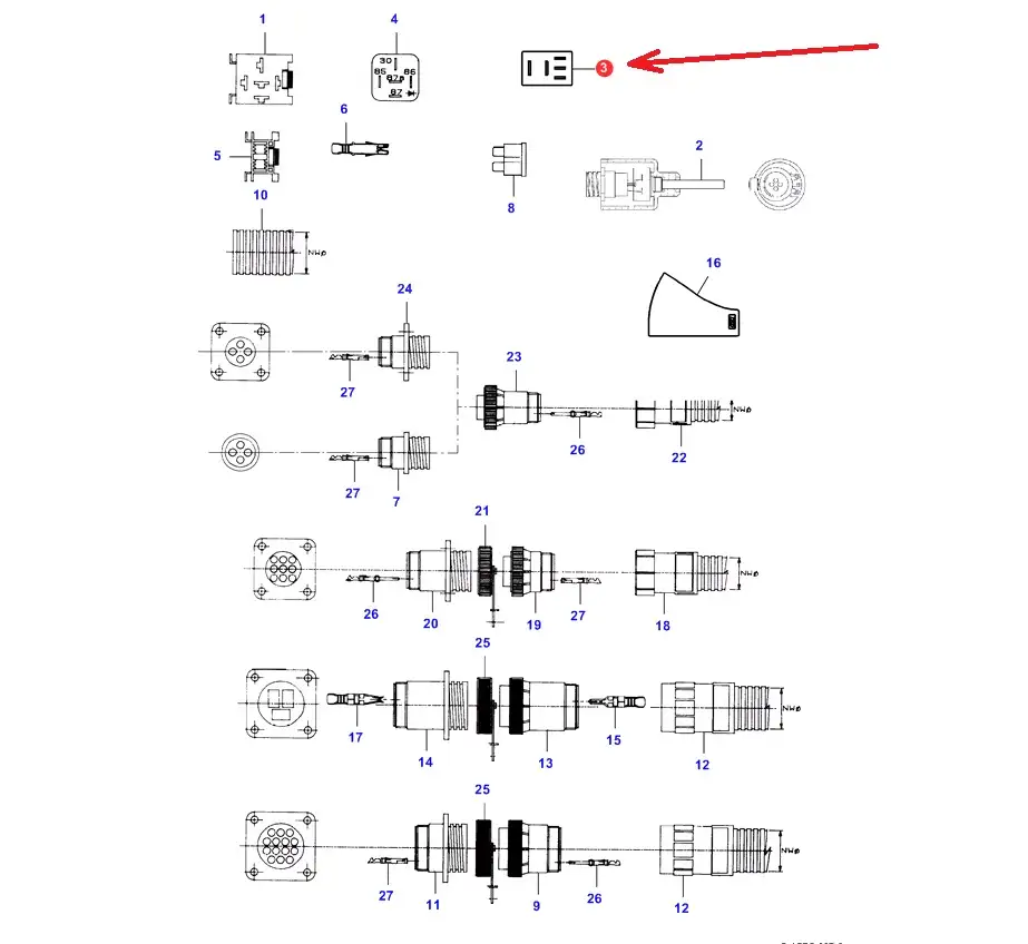 Pzekaźnik Micro 12V 20-10A o numerze katalogowym 4RD965453-041, stosowany w kombajnach zbożowych marek Massey Ferguson, Fendt i Challenger.