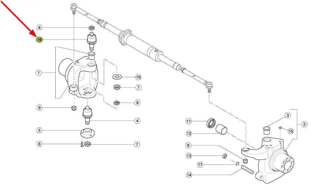 Sworzeń przegub kulowy górny zwrotnicy amortyzowanej osi przedniej o numerze katalogowym 6000104481, stosowany w ciągnikach rolniczych marek Claas, Renault.