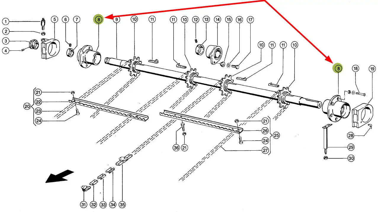 Łożysko z oprawą wału podajnika pochyłego o numerze katalogowym 630350.01, stosowane w kombajnach zbożowych marki Claas.