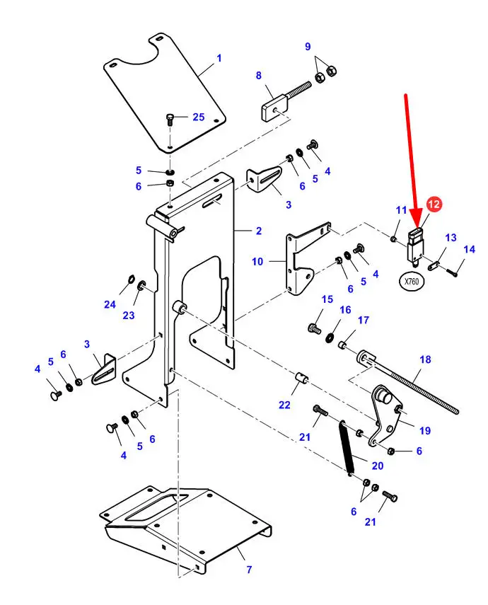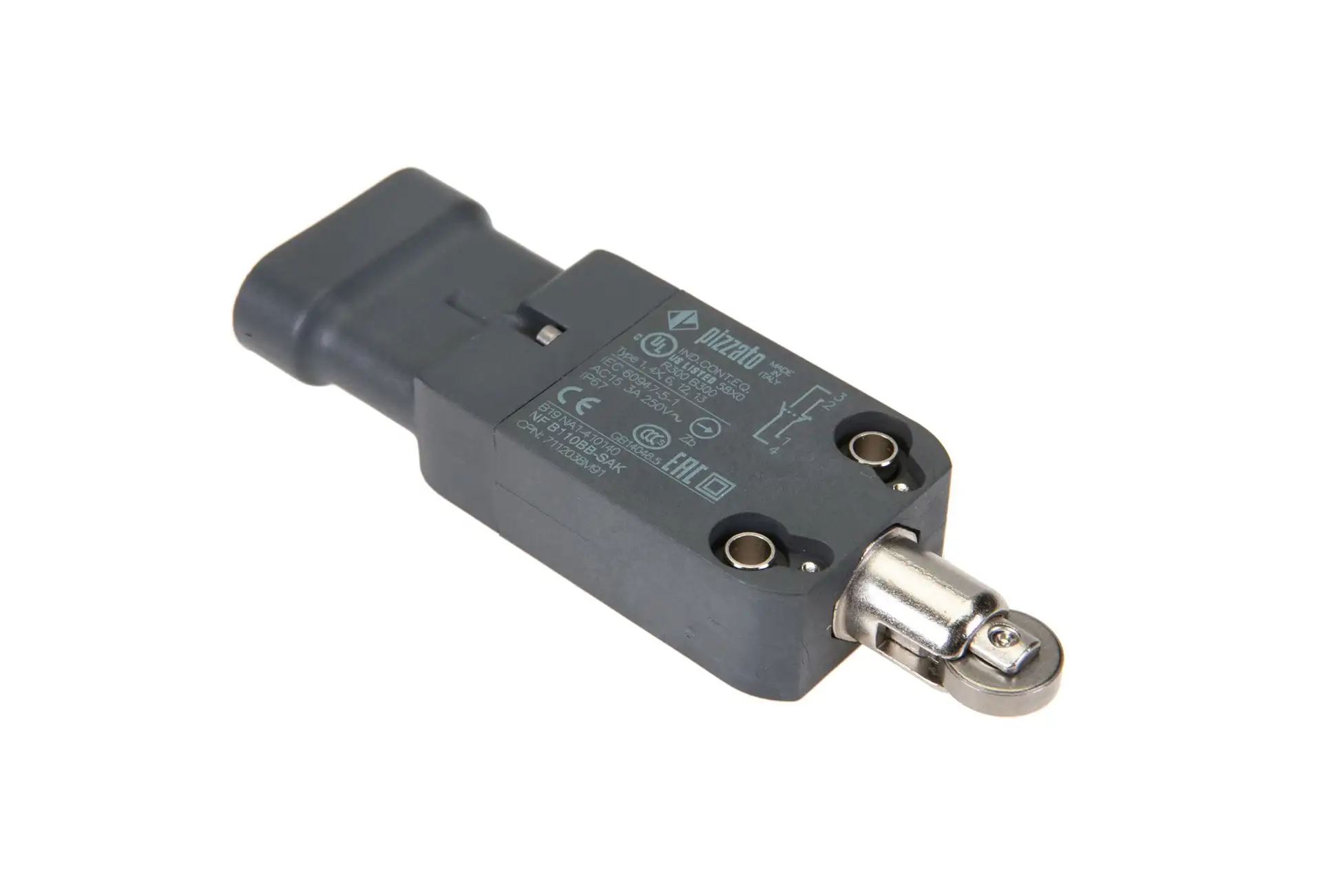 Oryginalny włącznik krańcowy napędu hederu i siekacza o numerze katalogowym 7112038M91, stosowany w kombajnach zbożowych marek Laverda, Fendt oraz Massey Ferguson.