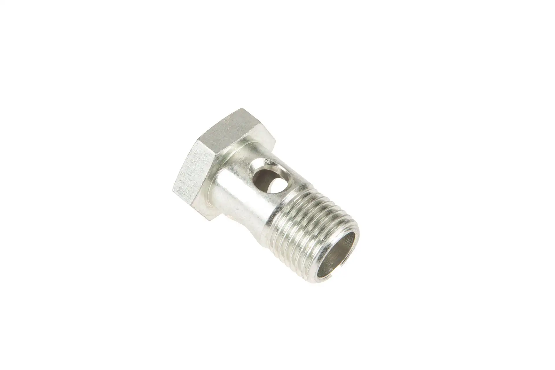 Oryginalna śruba przelewowa układu hydraulicznego przedniego podnośnika typu Banjo Bolt o wymiarach M16 x 1,5 x 28, 4 otwory i numerze katalogowym 7700063418, stosowana w ciągnikach rolniczych marki Claas.