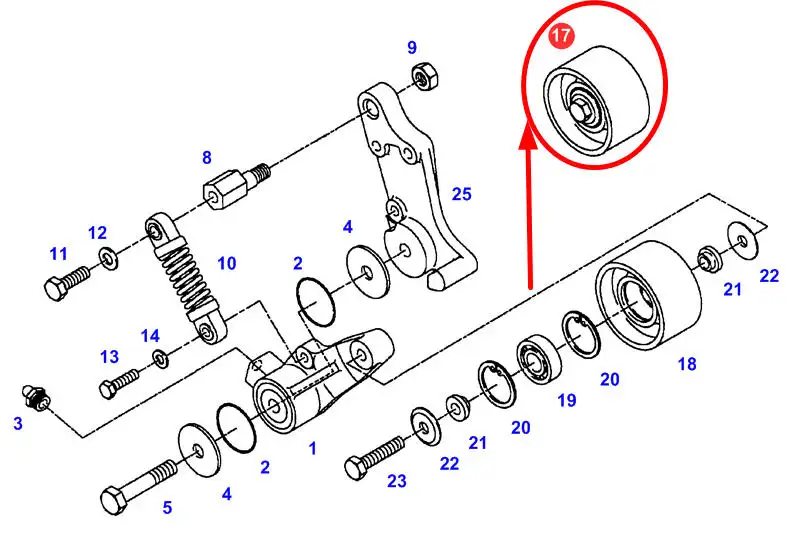 Część zamienna oryginalnego napinacza paska klinowego o parametrach średnicy wewnętrznej 15 mm marki Fendt oraz o numerze katalogowym 916201040180, stosowana w ciągnikach marki Fendt