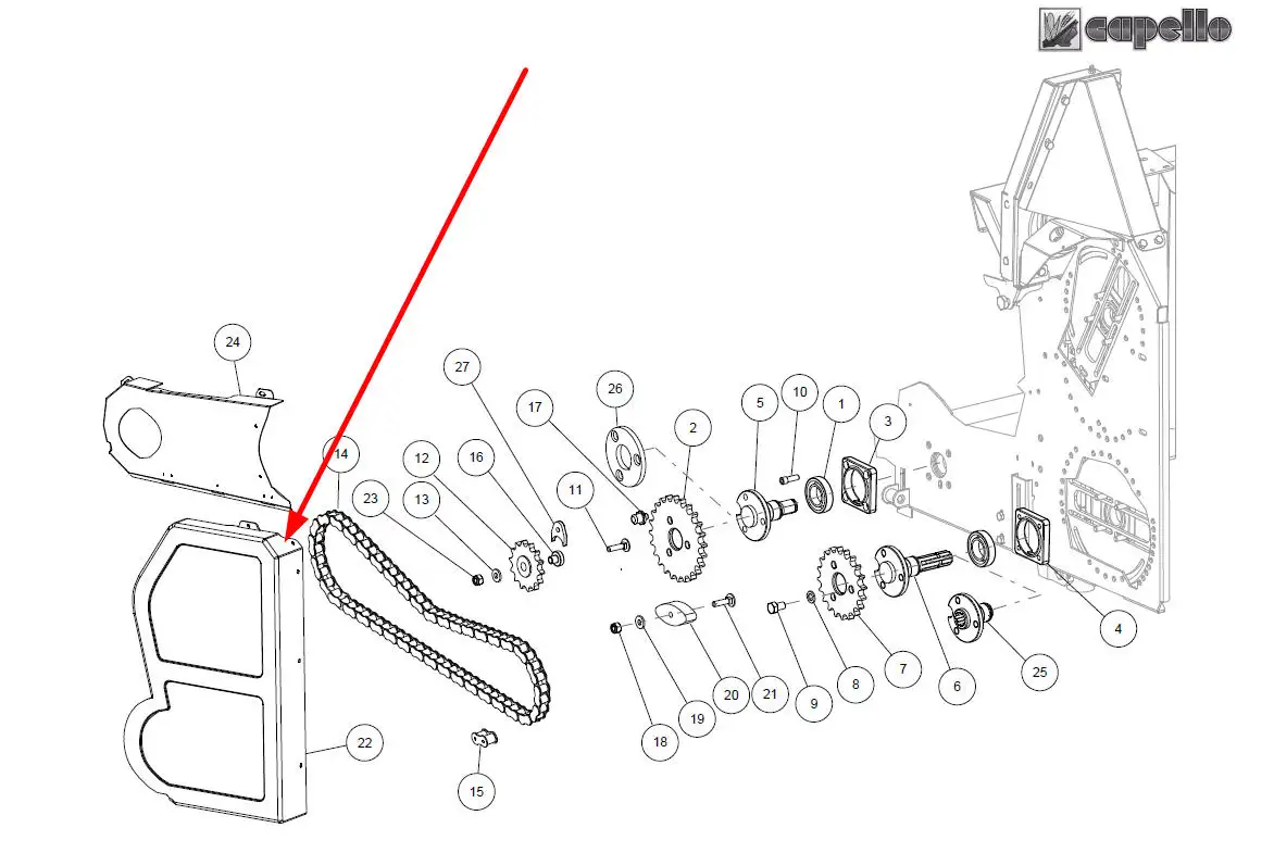 Oryginalna lewa osłona przekładni łańcuchowej o numerze katalogowym 03213300, stosowana w przystawkach do kukurydzy marki Capello.