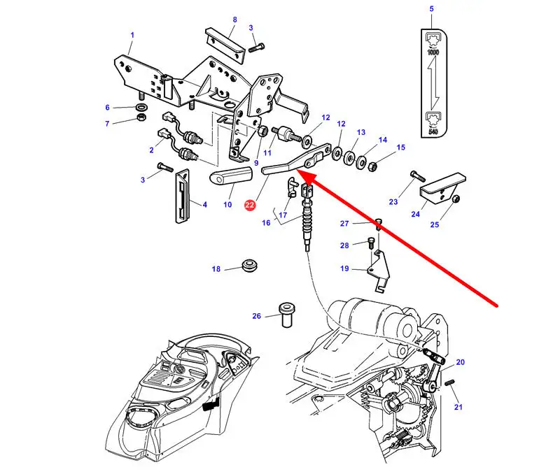 Oryginalna, pochodząca z dekompletacji, mogąca nosić ślady użytkowania dźwignia sterowania, o numerze katalogowym MF4274431M1, stosowana w ciągnikach rolniczych marki Massey Ferguson.