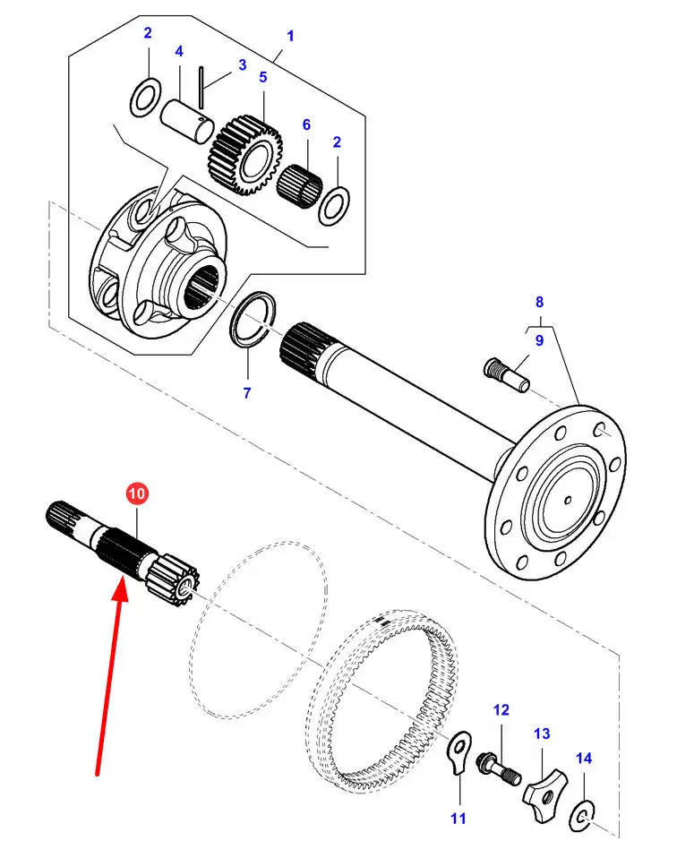 Oryginalny wałek Z=14 L=245 mm, stosowany w ciągnikach rolniczych marki Massey Ferguson.
